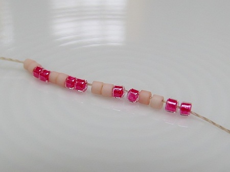 - dans notre échantillon, nous avons utilisé 16 Delica en deux couleurs alternées, formant ainsi 4 paires de perles pour la 1e rangée et 4 paires pour la 2e rangée