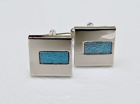 Boutons de manchette, carré plat, verre bleu turquoise rectangulaire décentré, argentè