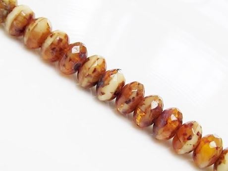 Tsjechische facetkralen, rondellen, 5x8 mm - maïs zijde wit, ondoorzichtig, honingbruin glazuur – een eenheid bevat 24 kralen