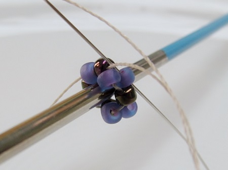 - creëer de eerste rij: *raap een nieuwe kraal op, sla een kraal over en ga doorheen de volgende kraal**