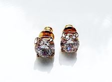 Oorknopjes in “briljant” slijpvorm, verguld sterling zilver (goud op sterling zilver = vermeil), large: één enkele ronde kubiek zirkonia met in facetten geslepen zijden in een gele vermeil chaton zetting – breedte 8 mm